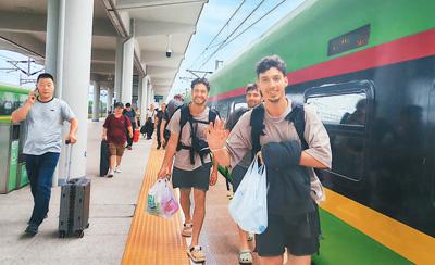 外国旅客乘坐中老铁路跨境旅客列车抵达云南磨憨站。黄远飞摄  |